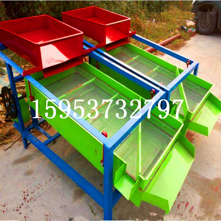 该精选筛为二层筛网,先经过进料口处风机抽风,直接抽走重量轻的杂叶或麦秸秆,上层筛的初次筛分再把大杂清理过,好的粮食(种子)直接落到下层筛网上,下层筛网会把粮食(种子)中的小杂.小石子.有缺陷的粮食(种子)直接漏掉,完好的粮食(种子)会从出料口筛分出来。该小型清粮机解决了扬场机的功能单一,不能有效去除石子.土块的缺陷,更能为清理.净选粮食(种子)带来满意的效果。该机有占地小,移动方便,便以维修,除尘除杂效率明显,能耗低,使用简便等优点。