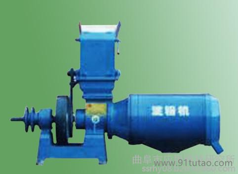 该机主要有进料口、刺辊(锤式)破碎机头、锥磨组合、分离筒、搅拌器、间隙调节装置、机座等部分组成。淀粉原料被送入喂料口后,在刺辊作用下被粉碎成丝状,并被带进锥磨座。在螺旋轴的推动下,被挤进由锥磨内外壳形成的狭小缝隙中,在锥磨内壳的转动作用下物料进一步被挤压、粉碎、研磨,从而使淀粉从纤维上游离出来。被研磨后的物料挤进分离筒后在搅拌轴的作用下与水充分混合,其中游离的淀粉溶入水中,通过分离筛流出并被收集待用,剩余的渣滓在搅拌轴的推进下,被推出分离筒外。