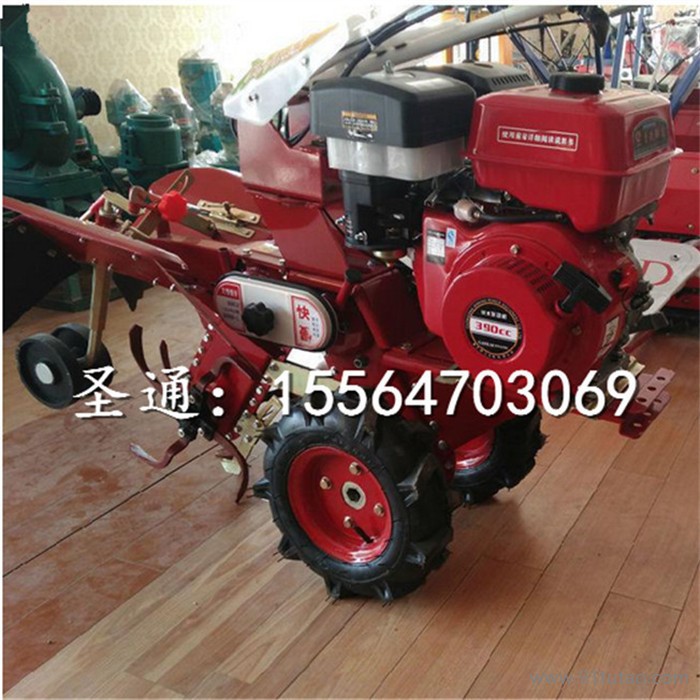 机器包括机架、可调高低扶手,机架上设有(风冷或水冷)柴油机或汽油机、机架和扶手上设置有变速箱,变速箱的输出轴上设置有能够沿轴移动的驱动轮或链轨;传动方式主要有:全齿轮传动、皮带传动、链条传动三种传动方式;该机具有重量轻,油耗低、相对功率大,结构紧凑、机动性强、操纵轻便灵活的特点,可爬坡、越埂、阶梯性强。是大中型农机无法媲美的多功能田园管理机,工作稳定可靠、使用寿命长、维修方便等特点,是进入农民家庭理想的田园管理机。